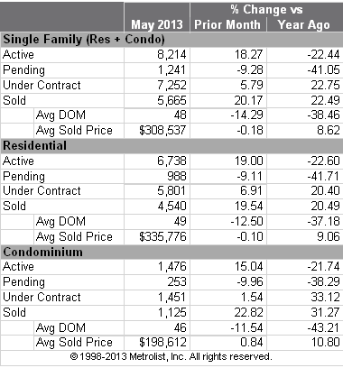 BREAKING NEWS: Metrolist just released the May 2013 stats for Metro Denver. The total number of homes (residential and condo/town home) on the market is up 18% from last month. Hooray for more inventory!!