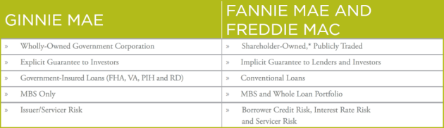 Below is an explanation of the key differences between Ginnie Mae and the Government-Sponsored Enterprises (GSEs), Fannie Mae and Freddie Mac (source: ginniemae.gov):