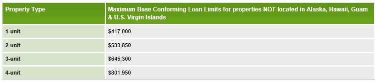 Below are the loan limits for both Freddie Mac and Fannie Mae conforming loans: