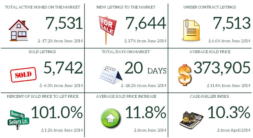 At the end of June 2015, there were 7,531 homes on the market (down 17.1% from June 2014). 7,513 homes were under contract at the end of June 2015 (up 6.6% from June 2014). There were 5,742 homes sold in June 2015 (down 6.0% from June 2014). It took on average 20 days for a home to go under contract in June 2015 (down 28.2% from June 2014). The average sold price in June 2015 was $373,905 (up 11.8% from June 2014). Finally, the average percent of sold price to list price in June 2015 was 101.0% (up 1.2% from June 2014).