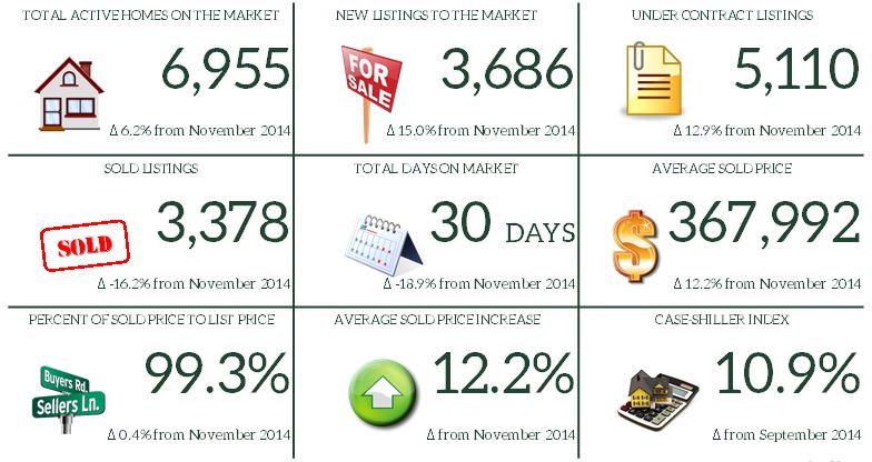 At the end of November 2015, there were 6,955 homes on the market (up 6.2% from November 2014). 5,110 homes were under contract at the end of November 2015 (up 12.9% from November 2014). There were 3,378 homes sold in November 2015 (down 16.2% from November 2014). It took on average 30 days for a home to go under contract in November 2015 (down 18.9% from November 2014). The average sold price in November 2015 was $367,992 (up 12.2% from November 2014). Finally, the average percent of sold price to list price in November 2015 was 99.3% (up 0.4% from November 2014).