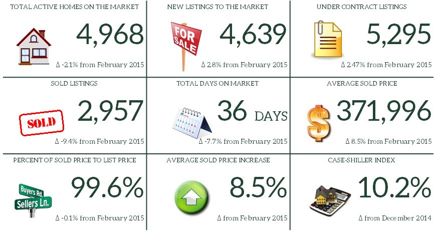 At the end of February 2016, there were 4,968 homes on the market (down 2.1% from February 2015). 5,295 homes were under contract at the end of February 2016 (up 2.4% from February 2015). There were 2,957 homes sold in February 2016 (down 9.4% from February 2015). It took on average 36 days for a home to go under contract in February 2016 (down 7.7% from February 2015). The average sold price in February 2016 was $371,996 (up 8.5% from February 2015). Finally, the average percent of sold price to list price in February 2016 was 99.6% (down 0.1% from February 2015).